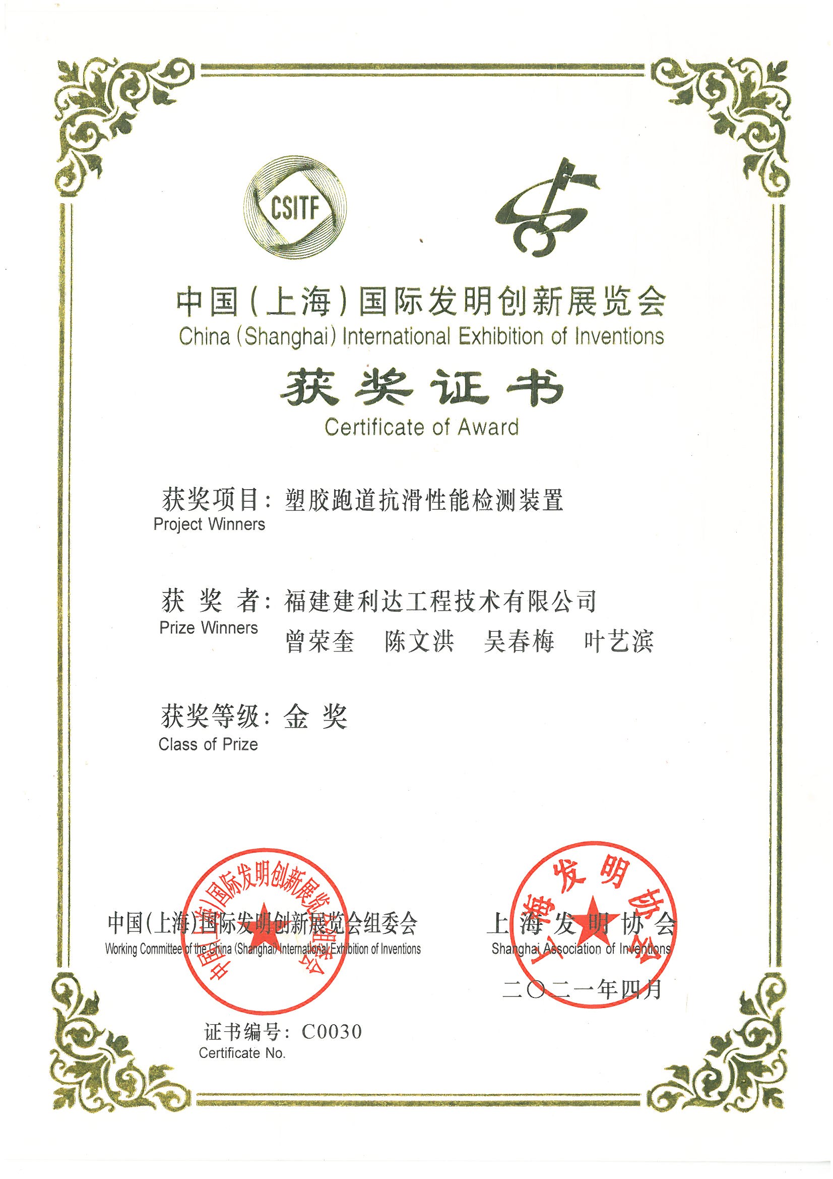 中國(guó)(上海)國(guó)際發(fā)明創(chuàng)新展覽會(huì)金獎(jiǎng)-塑膠跑道抗滑性能檢測(cè)裝置
